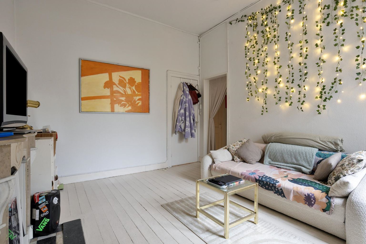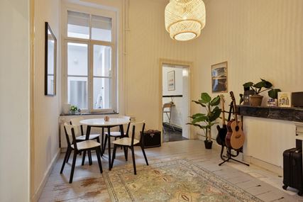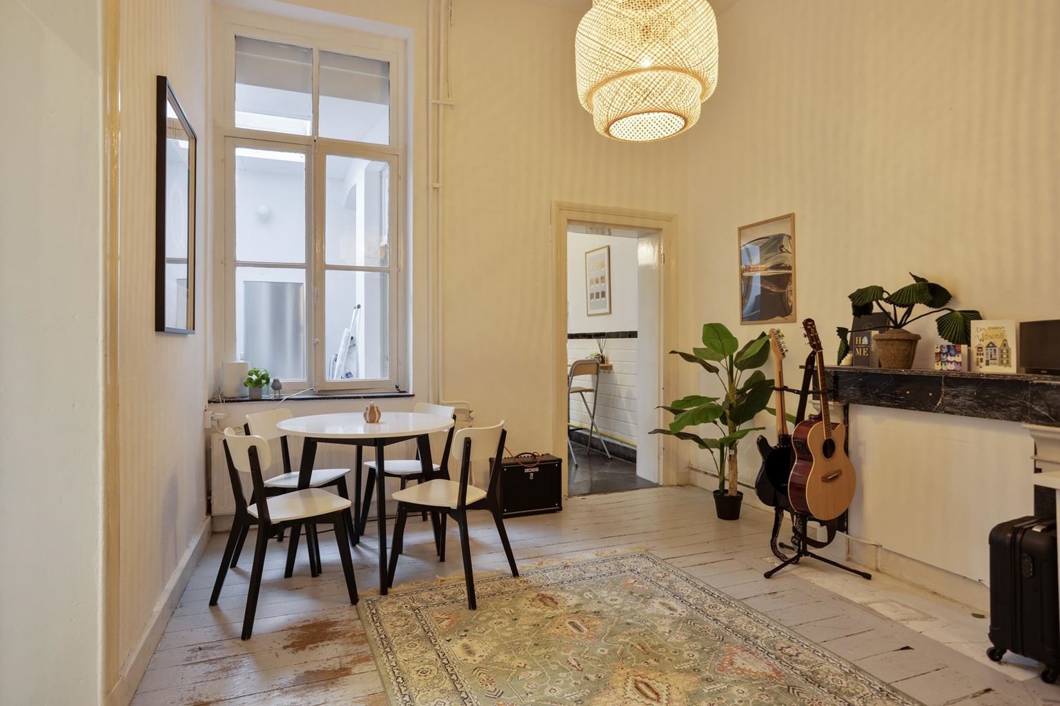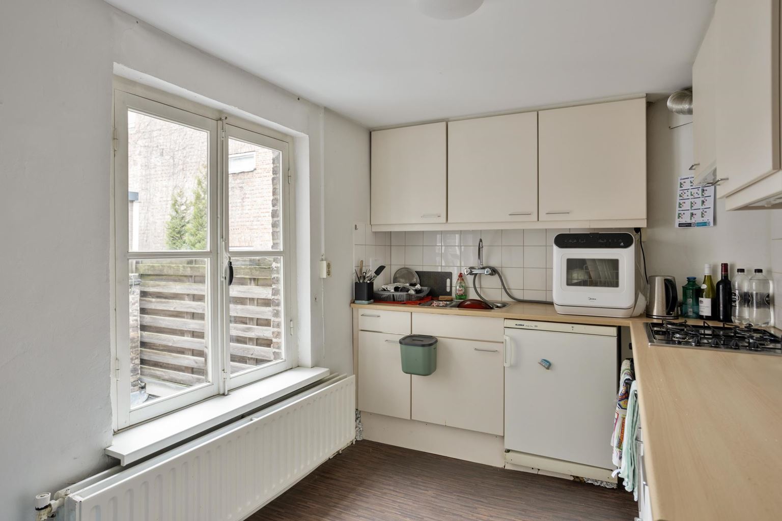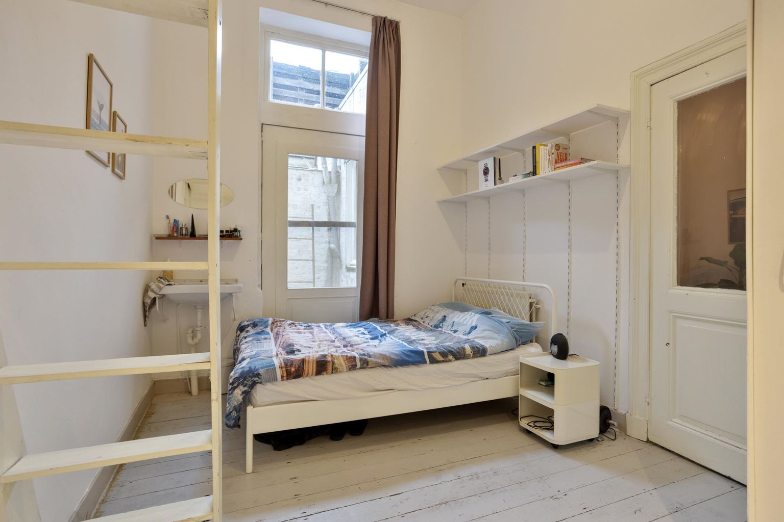 Het appartement op de tweede verdieping is eveneens bereikbaar via de gemeenschappelijke overloop en beschikt over een woonkamer, een aparte keuken met gescheiden eetkamer, een slaapkamer en een badkamer.