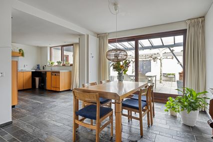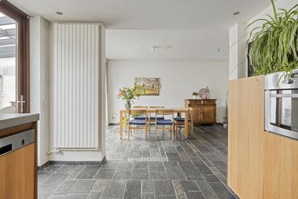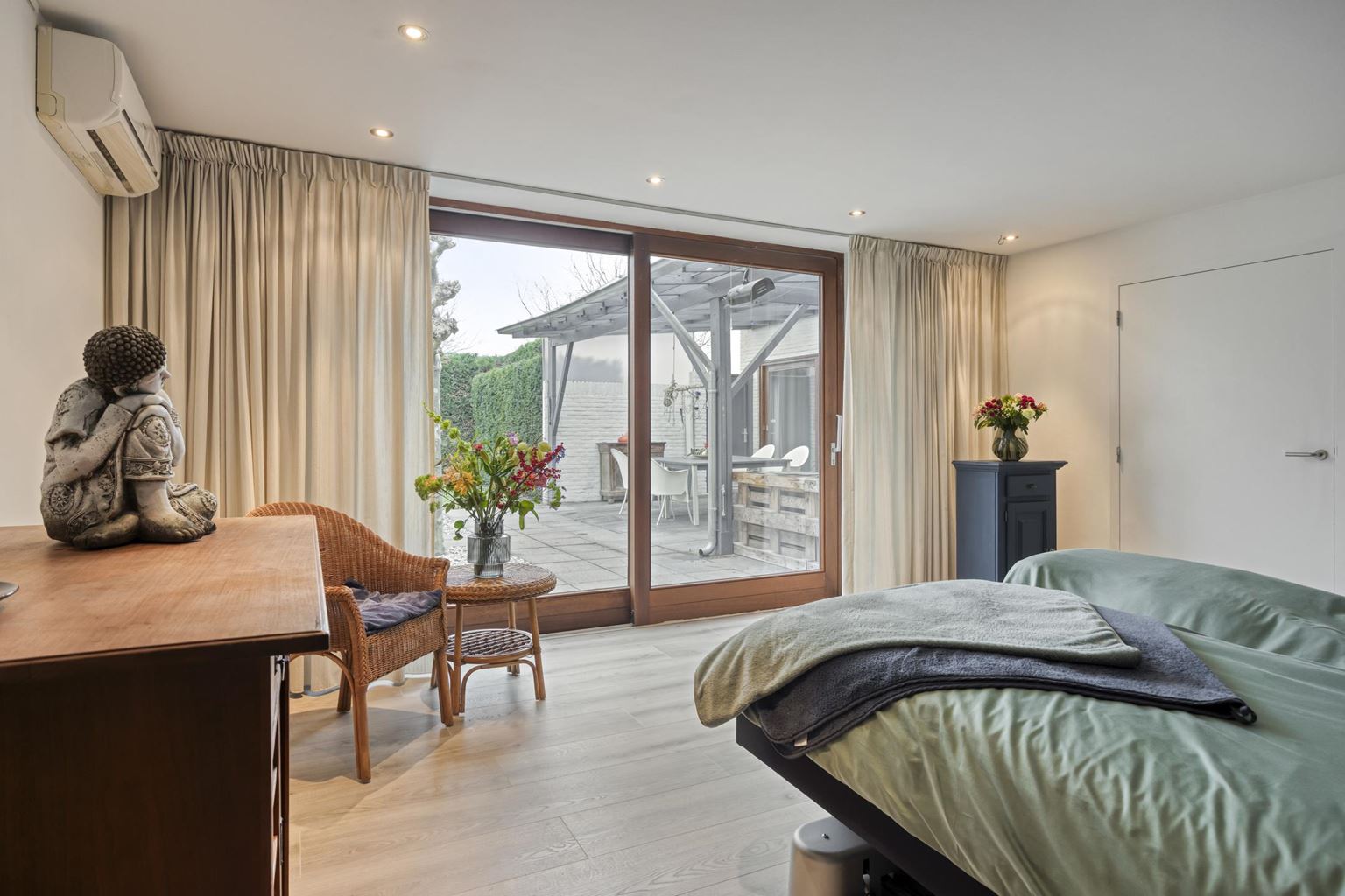 Via de entree (ca.14m²)betreedt men de woning, waar u toegang heeft tot de meterkast, het toilet, de berging, de badkamer en de living. Daarnaast bevindt zich hier de karakteristieke wenteltrap naar de eerste verdieping. Het toilet is deels betegeld en voorzien van een staand toilet. De L-vormige living (ca.44m²) voelt bijzonder ruim en licht aan dankzij de royale daglichttoetreding. Aan de achterzijde zorgen grote raampartijen en een schuifpui voor direct contact met de tuin, waardoor binnen en buiten naadloos in elkaar overlopen. De open keuken (ca.13m²) is ruim opgezet en uitgevoerd in een praktische U-wandopstelling met houten onderkasten en lades, afgewerkt met een stijlvol betonlook werkblad. De keuken is compleet uitgerust met moderne inbouwapparatuur, waaronder een 4-pits inductiekookplaat, afzuigkap met houten omlijsting, oven, vaatwasser, hoog model koelkast en een dubbele spoelbak. De hal, living en keuken zijn voorzien van een duurzame en sfeervolle leistenen tegelvloer, wat zorgt voor een rustige en tijdloze uitstraling. De badkamer beschikt over een antislip vloer en is compleet ingericht met een staand toilet, wastafelmeubel, spiegel-/toiletkast, opbergwandmeubel en een douche. Vanuit de badkamer zijn de overige vertrekken bereikbaar. Slaapkamer I (ca.22m²) is een comfortabele ruimte met airconditioning, een houten vloer en een schuifpui naar de tuin. Vanuit deze slaapkamer is slaapkamer II (ca.17m²) toegankelijk, ideaal te gebruiken als inloopkast, kleedruimte of extra slaapkamer en beschikt over vloerbedekking.