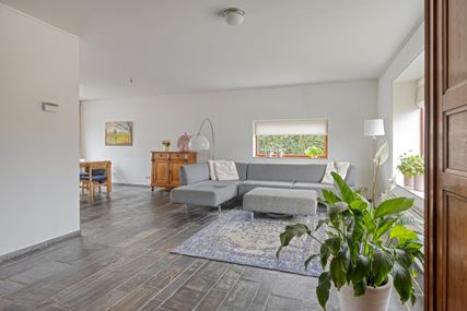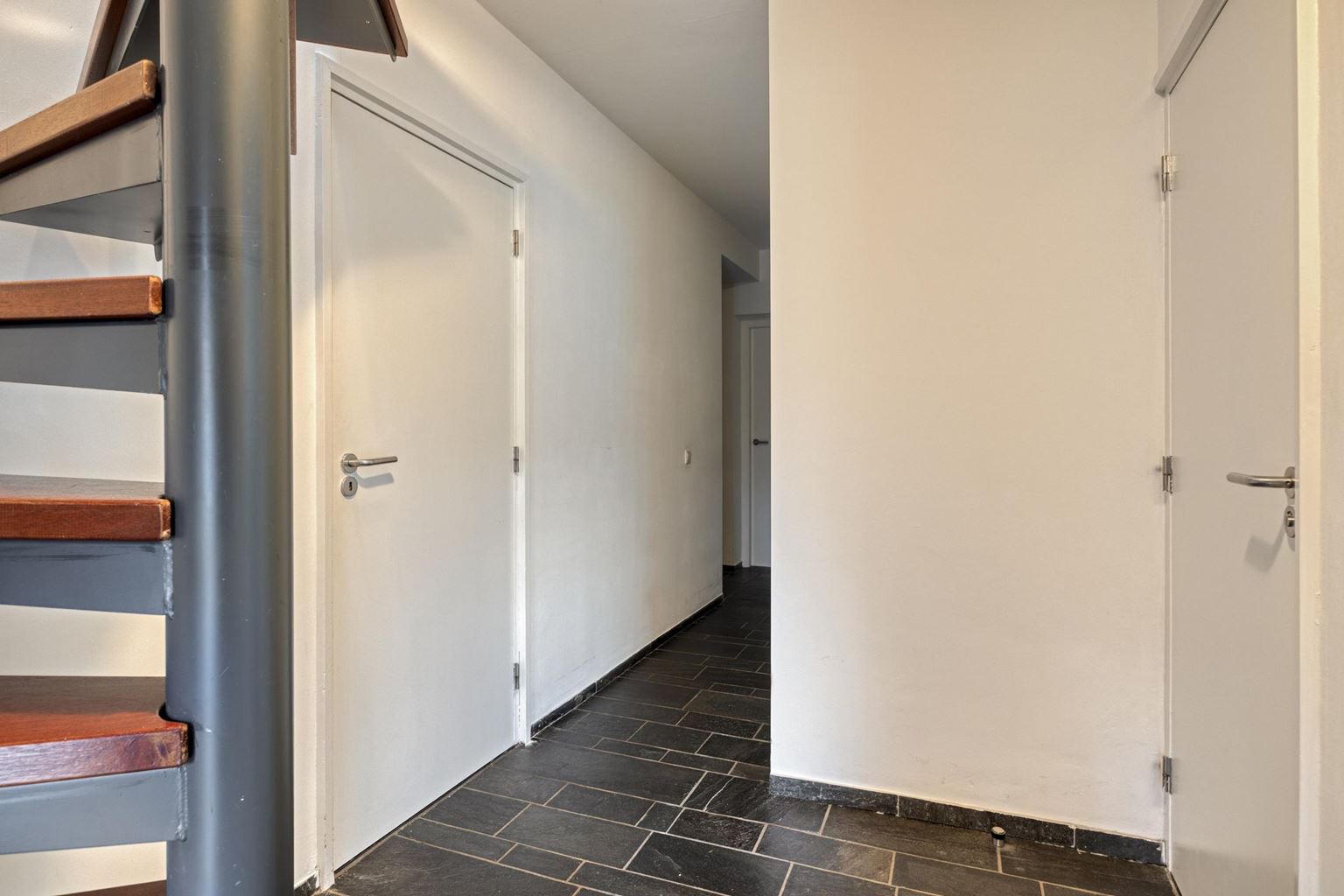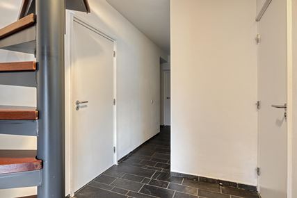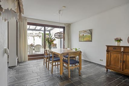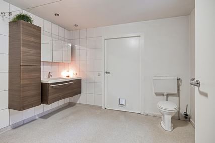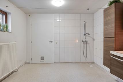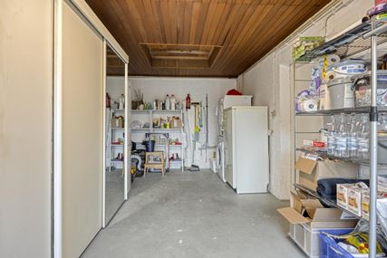 Aan de linkerzijde van de inkom bevindt zich de royale berging (ca.16m²), die in het verleden als garage heeft gediend. Hier treft u de witgoedaansluitingen aan en beschikt u over volop bergruimte.